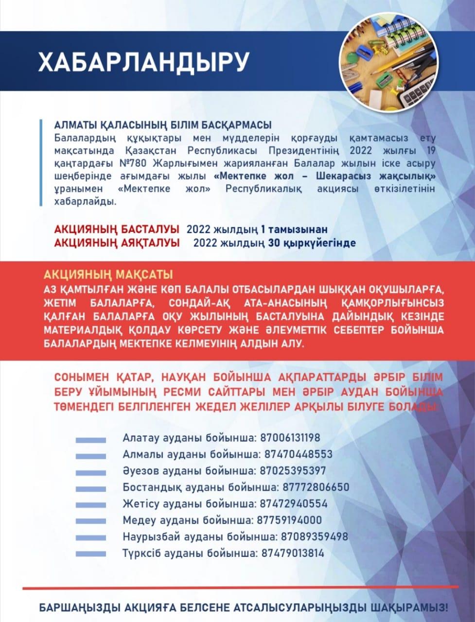 №81 мектеп-гимназия әкімшілігі мен ұжымы 2022 жылдың 1 тамызы мен 30 қыркүйегі аралығында еліміздің барлық өңірлерінде өткізілетін "Мектепке жол" республикалық қайырымдылық акциясына қатысуға шақырады.