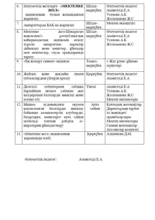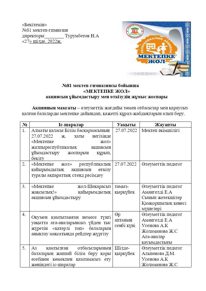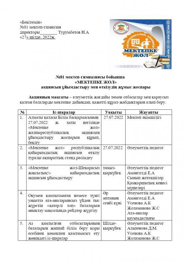 «МЕКТЕПКЕ ЖОЛ» акциясын ұйымдастыру мен өткізудің жұмыс жоспары