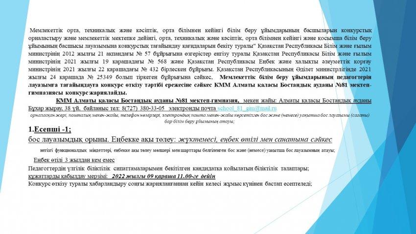 05 қараша 2022 0 1 2 3 4 5 Бос жұмыс орыны. Конкурс Алматы қаласы Бостандық ауданы № 81 мектеп-гимназиясы ENBEK.KZ электронды биржасына, әлеуметтік желі нысандарына мемлекеттік білім беру ұйымдары бос лауазымға тағайындауға конкурс жариялайды! Осы беттің QR-коды:QR-код этой страницы: