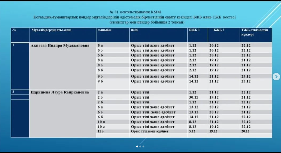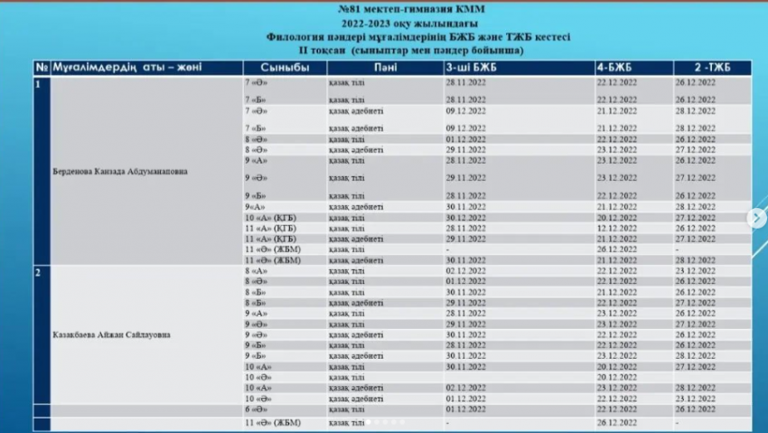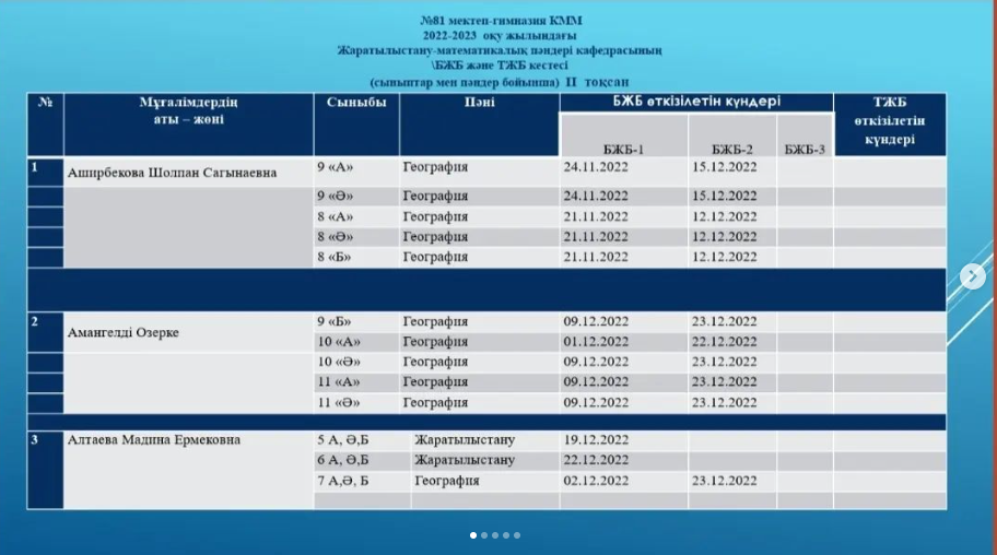 01 желтоқсан 2022 0 1 2 3 4 5 ІІ тоқсан бойынша оқыту кезіндегі БЖБ және ТЖБ кестелері ІІ тоқсан бойынша оқыту кезіндегі БЖБ және ТЖБ кестелері Осы беттің QR-коды:QR-код этой страницы:
