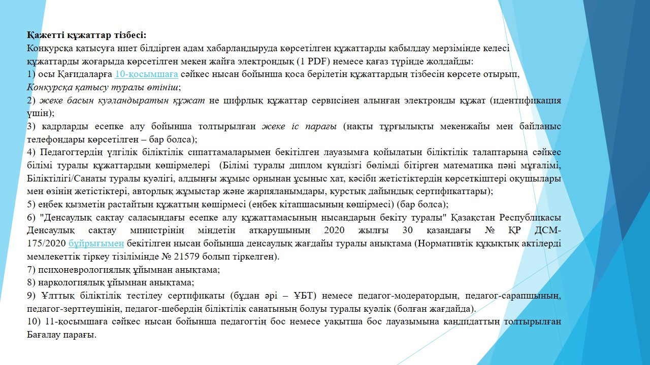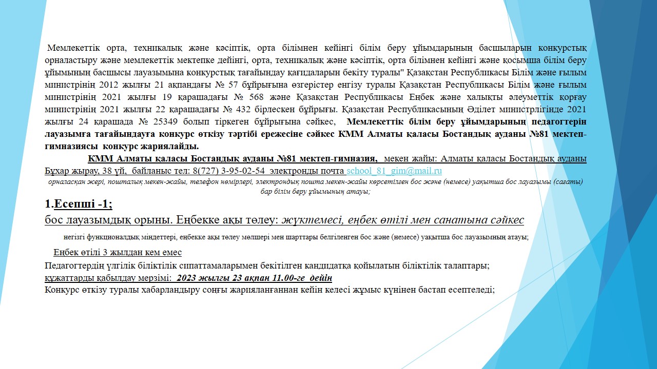 09 ақпан 2023 0 1 2 3 4 5 Бос лауазымға тағайындауға конкурс жариялаймыз Алматы қаласы Бостандық ауданы, № 81 мектеп-гимназиясы ENBEK.KZ электронды биржасына, әлеуметтік желі нысандарына мемлекеттік білім беру ұйымдары бос лауазымға тағайындауға конкурс жариялайды! Осы беттің QR-коды:QR-код этой страницы: