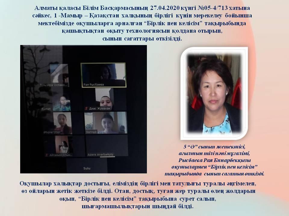 "1-Мамыр – Қазақстан халқының бірлігі” күніне байланысты қашықтық сабағы. 5 "Ә" сыныбы