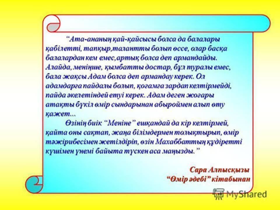 №81 мектеп-гимназиясында «Өзін – өзі тану » пәнінің негізін қалаушы Назарбаева Сара Алпысқызы туралы «Мейірім төгетін Ана» тақырыбында мектеп кітапханасында