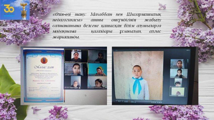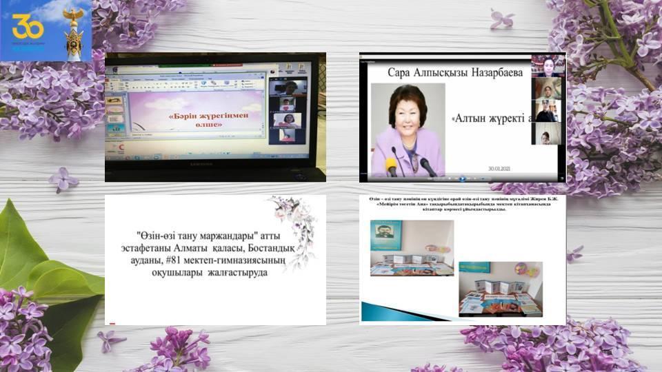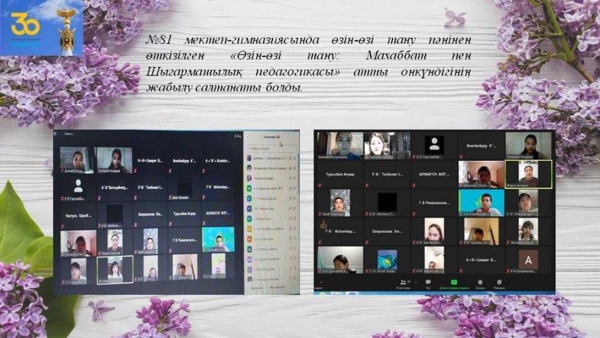 11 ақпан 2021 0 1 2 3 4 5 Өзін-өзі тану пәнінің жабылу салтанаты. №81 мектеп-гимназиясында өзін-өзі тану пәнінен өткізілген «Өзін-өзі тану: Махаббат пен Шығармашылық педагогикасы» атты онкүндігінің жабылу салтанаты болды. Осы беттің QR-коды:QR-код этой страницы: