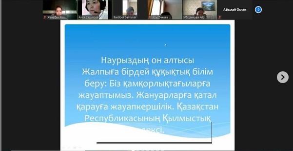 Жалпыға бірдей құқықтық білім беру мақсатында 5 "Ә" сыныбында "Біз қамқорлықтағыларға жауаптымыз. Жануарларға қатал қарауға болмайды" тақырыбында құқықтық білім беру сабағы өтті. Оқушылар ҚР заңнамасымен танысты. Сынып жетекшісі: Садыкова А.Р.
