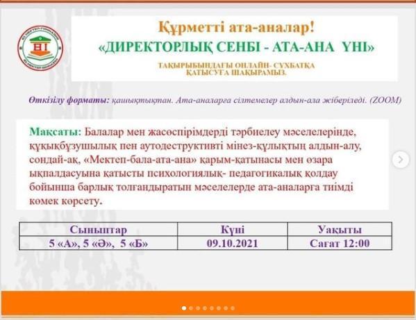 5 - сынып ата-аналарымен "Директорлық сенбі - ата-ана үні" тақырыбында онлайн-кездесу өтті.