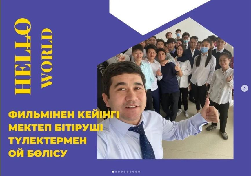 Бүгін мектеп директоры Нұрғали Асанұлы мектеп бітіруші түлектермен бірге Кана Бейсекеевтің “Hello world” деректі фильмін тамашалады. Оқушылар фильмнен шет елде жұмыс жасау, дамыған елдің қатарына қосылу, өз мамандығыңда шебер болу, IT саласы, идеялар мен ауқымды жобалар жайында көптеген мағлұматтар алды. Фильмнен кейін оқушылар өмірде мүмкіндікке ешқандай шектеу жоқ екендігін түсінгендей. Мектеп директоры Нұрғали Асанұлы түлектермен қызықты идеяларымен бөлісіп, сұхбат жүргізді.