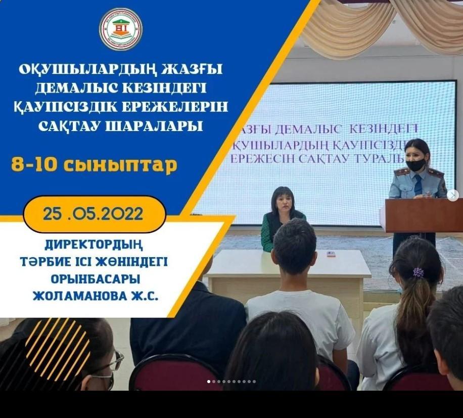 2021-2022 оқу жылының аяқталуына байланысты "ОҚУШЫЛАРДЫҢ ЖАЗҒЫ ДЕМАЛЫС КЕЗІНДЕГІ ҚАУІПСІЗДІК ЕРЕЖЕСІН САҚТАУ ШАРАЛАРЫ" тақырыбында директордың тәрбие ісі жөніндегі орынбасары Ж.Жоламанова және Бостандық ауданы полиция бөлімі