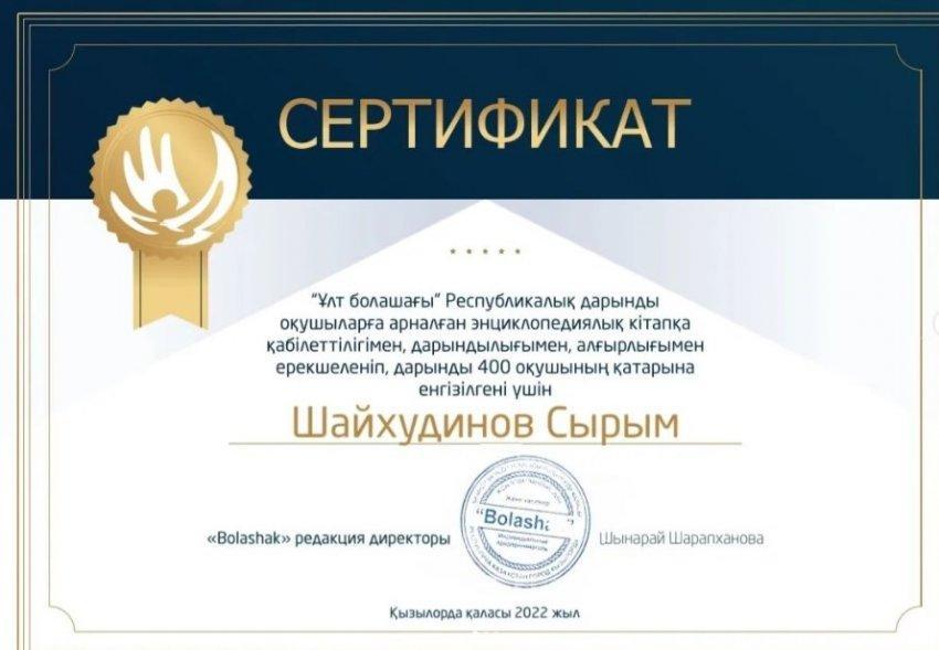 4 "Ә" сынып оқушысы Шайхудинов Сырым "Ұлт болашағы" республикалық дарынды оқушыларға арналған энциклопедиялық кітапқа дарындылығымен, қабілеттілігімен енді. Сынып жетекшісі: Ибраимова Г.К.