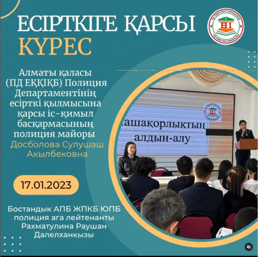 Бүгінде елімізде ғасыр дертіне айналған есірткі саудасы мен оның заңсыз айналымы белең алып тұр. Осы орайда «Қаламызда нашақорлыққа қарсы күрес жөнінде қандай шаралар жүзеге асып жатыр?», «Заңсыз есірткі саудасымен айналысқандарға қандай жаза қолданылады?» «Нашақорлықтың қалай алдын алуға болады?» және өзге де сұрақтар төңірегінде полиция майоры Досболова Сулушаш Акылбековна түсіндіру жұмысын тарын жүргізді.