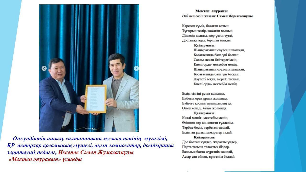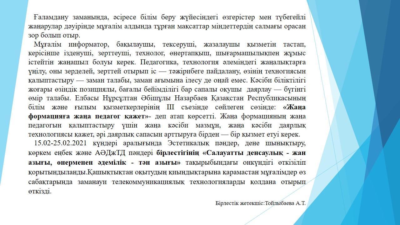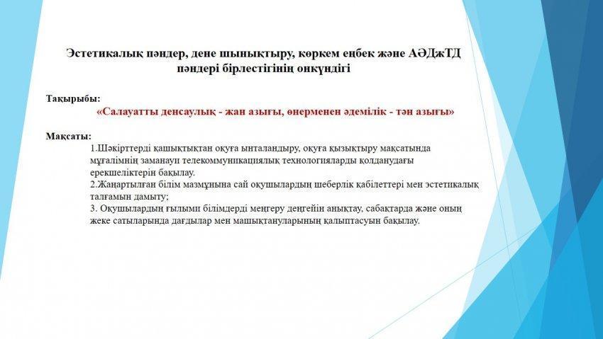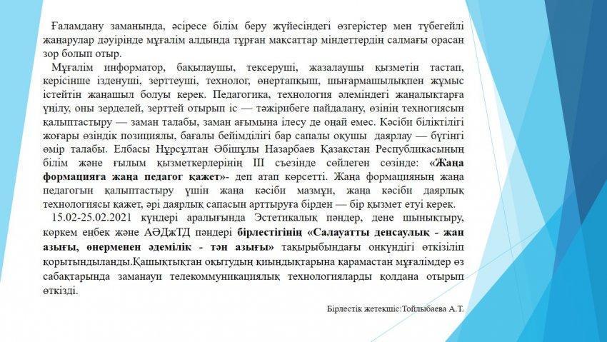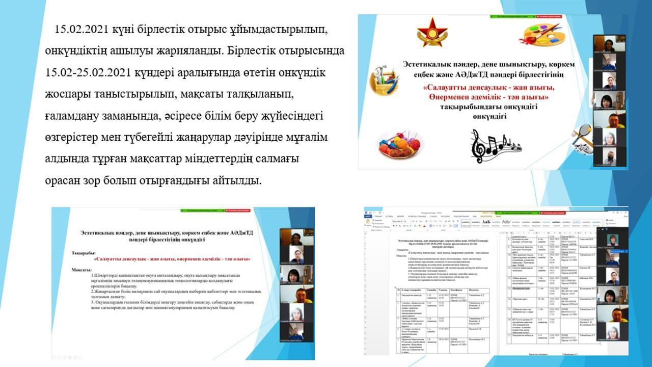 15.02-25.02.2021 күндері аралығында Эстетикалық пәндер, дене шынықтыру, көркем еңбек және АӘДжТД пәндері бірлестігінің «Салауатты денсаулық - жан азығы, Өнерменен әдемілік - тән азығы» тақырыбында онкүндігі өткізіліп қорытындыланды. Қашықтықтан оқытудың қиындықтарына қарамастан мұғалімдер өз сабақтарында заманауи телекоммуникациялық технологияларды қолдана отырып онкүндікте өз шеберліктерімен бөлісіп, тәжірибе алмасты.