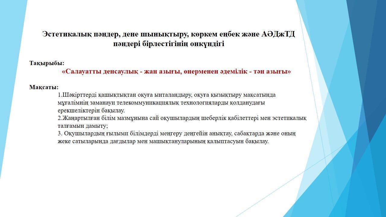 2.Жаңартылған білім мазмұнына сай оқушылардың шеберлік қабілеттері мен эстетикалық талғамын дамыту;