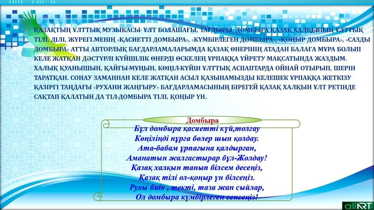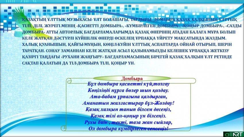 Бұл домбыра қасиетті күй,толғау Көңіліңді нұрға бөлер шын қолдау. Ата-бабам ұрпағына қалдырған, Аманатын жалғастырар бұл-Жолдау! Қазақ халқын танып білсем десеңіз, Қазақ тілі ол-қоңыр үн білсеңіз. Рухы биік , текті, таза жан сыйлар, Ол домбыра күмбірлеген сенсеңіз!