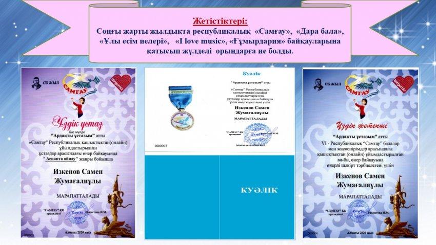 2020-2021 оқу жылының жарты жылдығы бойынша «Қасиетті домбыра» үйірмесінің жетістігі. Жетекшісі Изкенов С.Ж.
