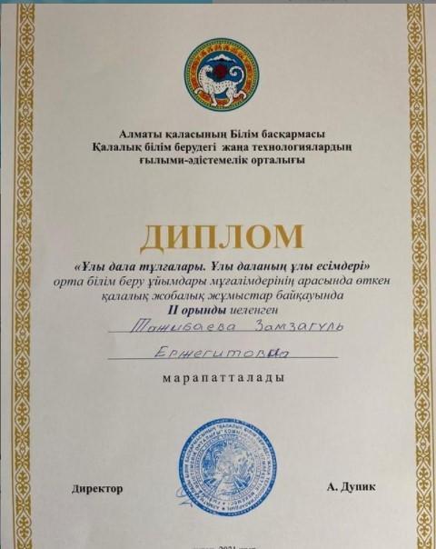 "Ұлы дала тұлғалары. Ұлы дала есімдері" тақырыбындағы орта білім беру ұйымдары мұғалімдері арасындағы қалалық ғылыми жоба байқауына бастауыш сынып мұғалімі, Тажибаева Замзагуль Ержигитовна қатысып, ІІ дәрежелі дипломмен марапатталды. Ізденімпаз ұстазымызды жеңісімен құттықтаймыз.