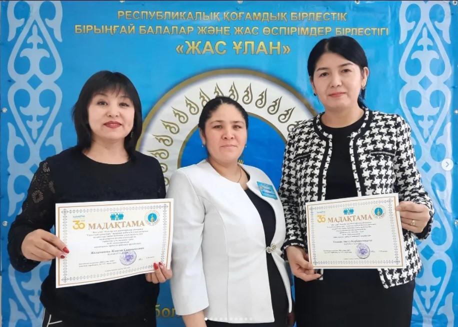 "ЖАС ҰЛАН" балалар мен жасөспірімдер ұйымында "Тәуелсіздік ұрпақтары" аудандық жобаға белсенді қатысып, патриоттық тәрбие бойынша үлкен жұмысы мен оқушылардың рухани-адамгершілік тәрбиесіне үлес қосқаны үшін директордың тәрбие ісі жөніндегі орынбасарлары Ж.Жоламанова және А.Усенова Бостандық ауданы, 3 Оқушылар үйінің "Жас ұлан" БЖҰ кеңесінің мадақтамасымен марапатталды.