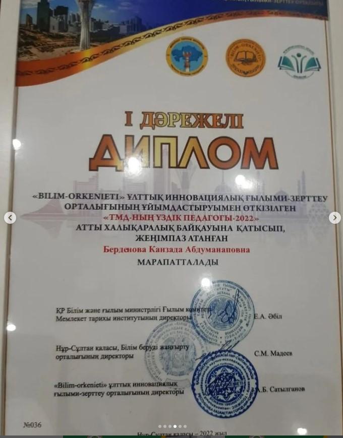 "BILIM ORKENIETI" ұлттық инновациялық ғылыми-зерттеу орталығының ұйымдастырылуымен өткізілген "ТМД-ның Үздік педагогі-2022" атты халықаралық байқауына қатысып, жеңімпаз атанған қазақ тілі мен қазақ әдебиеті мұғалімі К.Берденова ҚР Білім және Ғылым министрлігі Ғылым комитет Мемлекет тарихы институтының І дәрежелі дипломымен Нұр-Сұлтан қаласында марапатталды. Ұстазымызды жеңісімен құттықтаймыз????