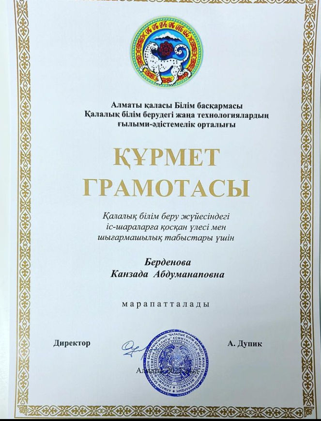 Қалалық білім беру жүйесіндегі іс шараларға қосқан үлесі мен шығармашылық табыстары үшін қазақ тілі мен қазақ әдебиеті мұғалімі Берденова Канзада Абдуманаповна Алматы қаласы Білім басқармасының “Құрмет грамотасымен” марапатталды.