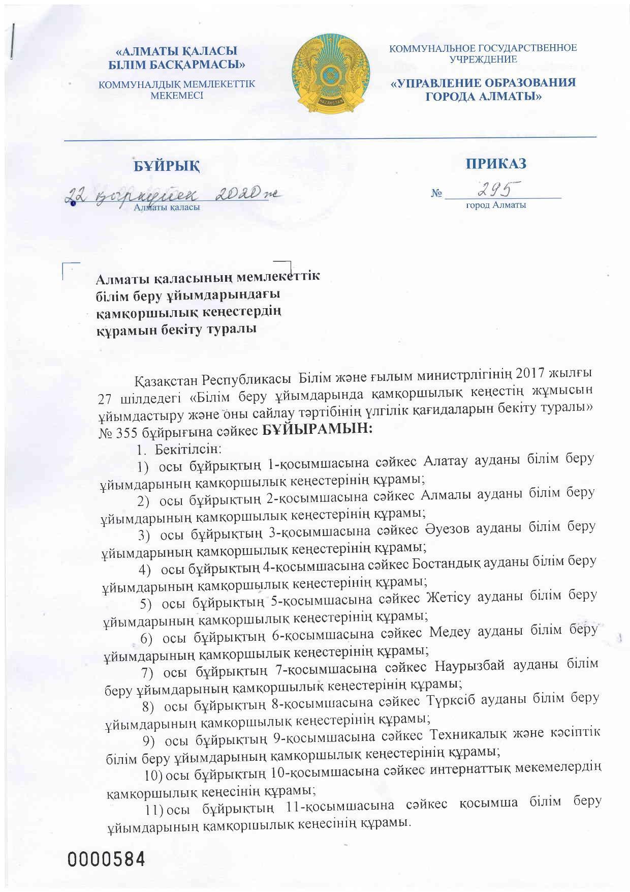 Алматы қаласындағы мемлекеттік білім беру ұйымдарындағы "Қамқоршылық кеңесі" құрамын бекіту туралы бұйрық