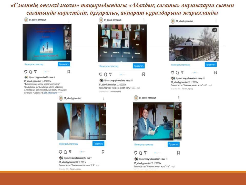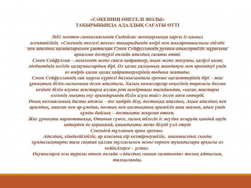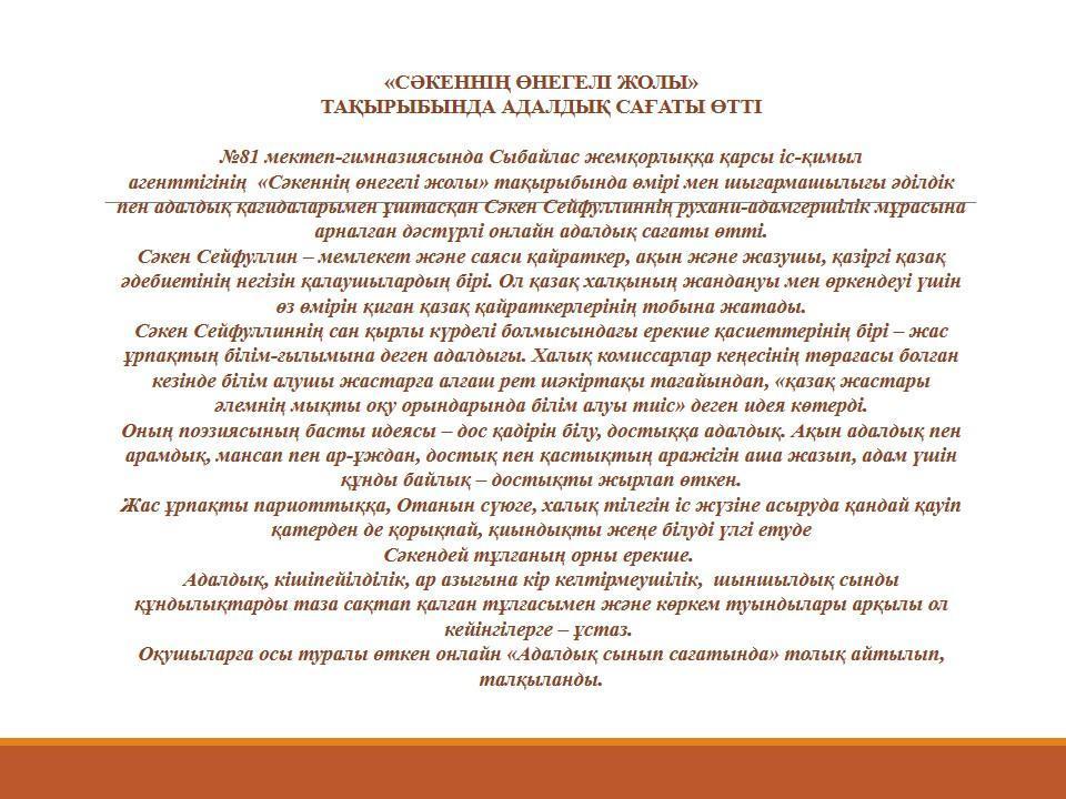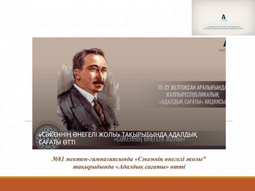 №81 мектеп-гимназиясында Сыбайлас жемқорлыққа қарсы іс-қимыл агенттігінің «Сәкеннің өнегелі жолы» тақырыбында өмірі мен шығармашылығы әділдік пен адалдық қағидаларымен ұштасқан Сәкен Сейфуллиннің рухани-адамгершілік мұрасына арналған дәстүрлі онлайн адалдық сағаты өтті.