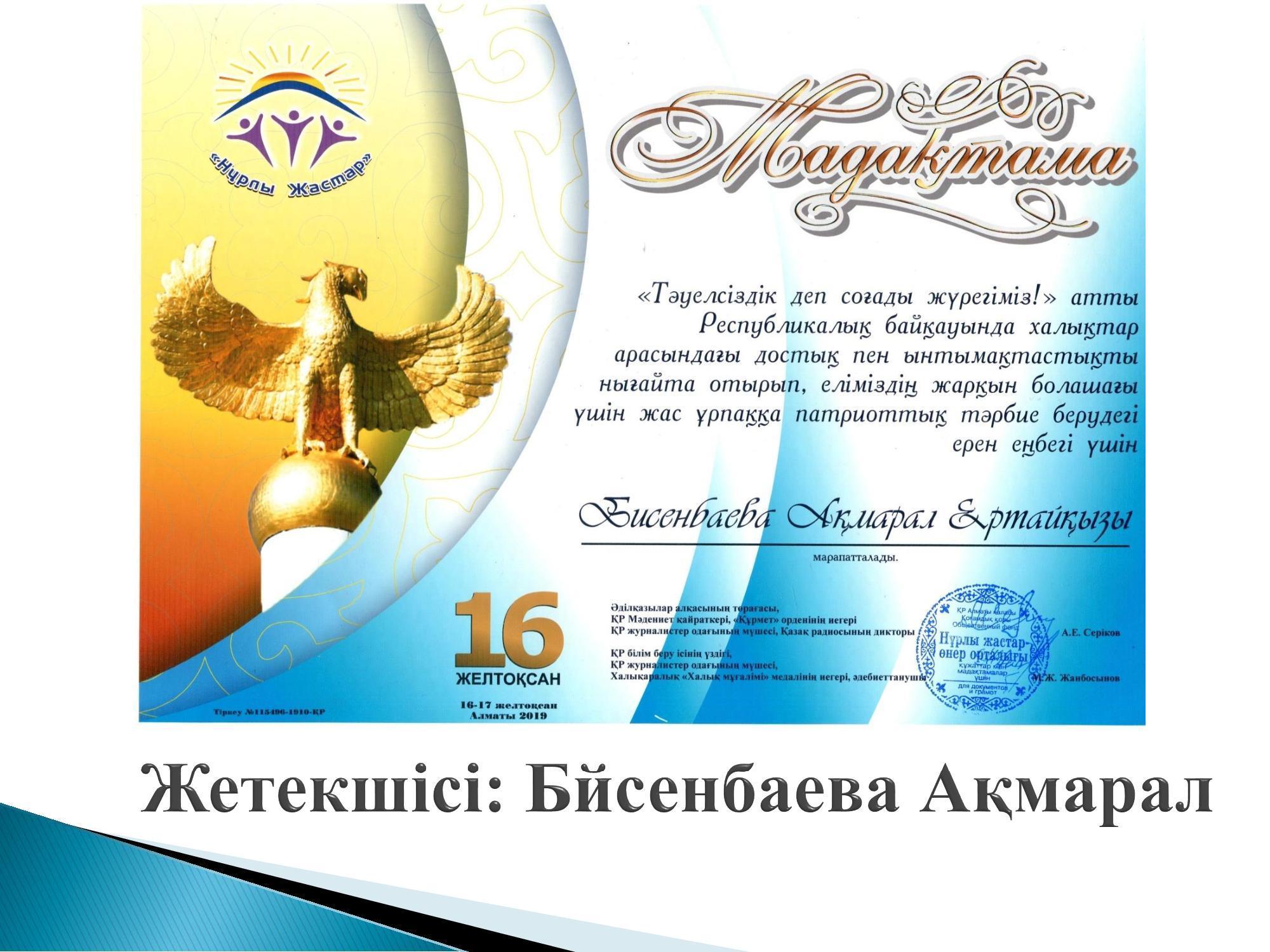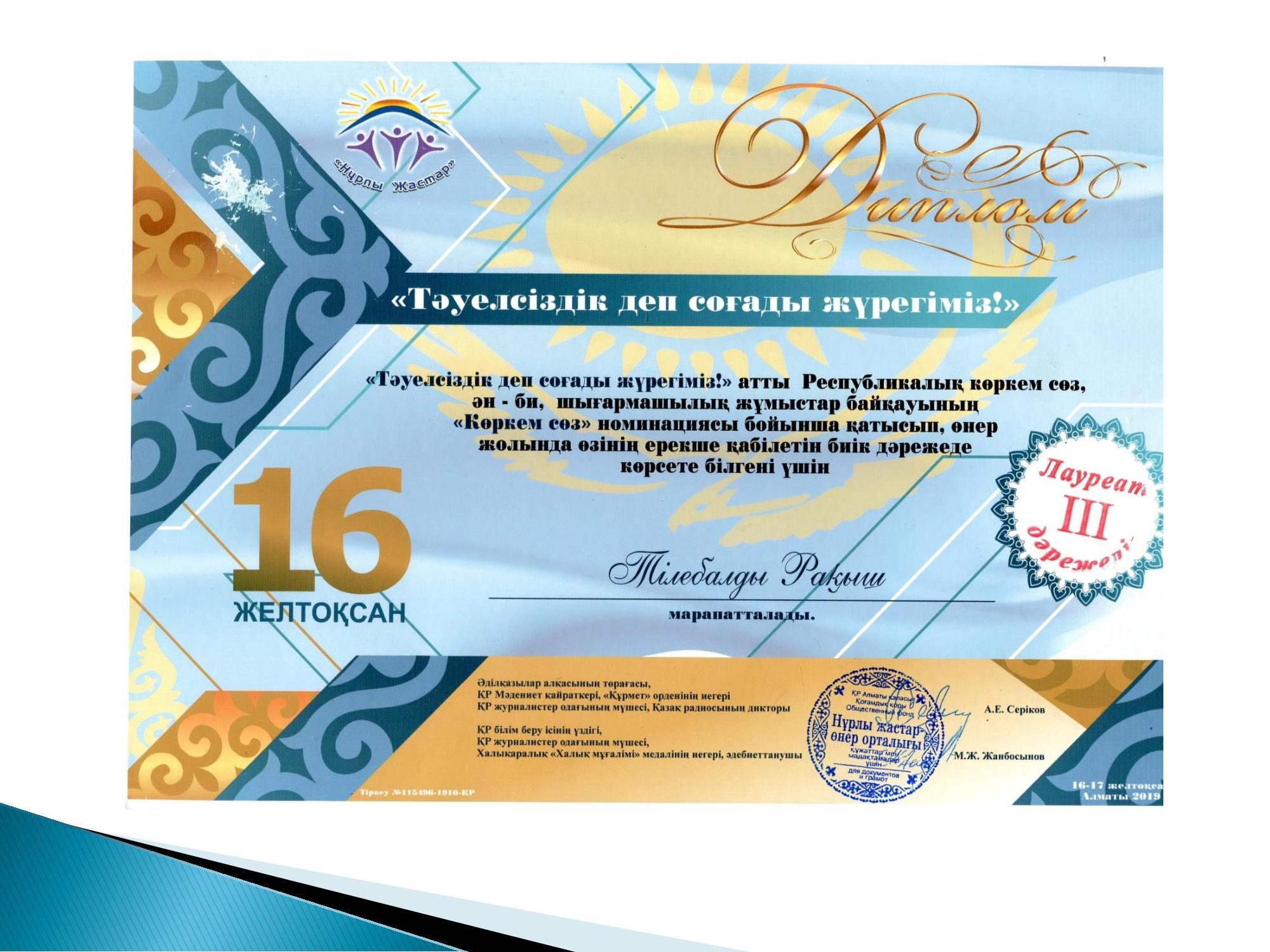 “Тәуелсіздік деп соғады жүрегіміз!” республикалық көркем сөз, ән-би шығармашылық жұмыстар байқауының жеңімпазы