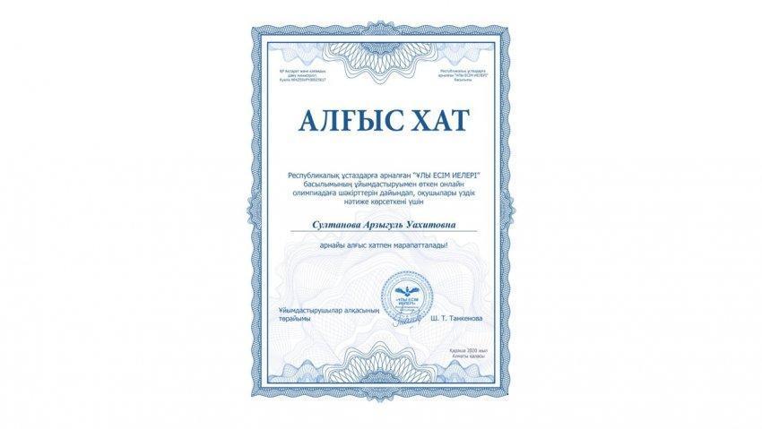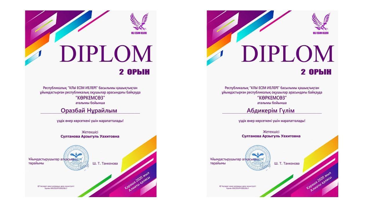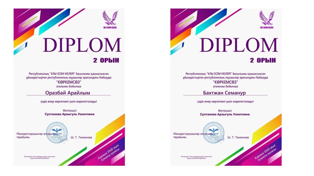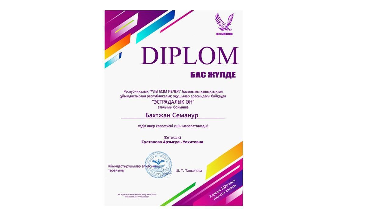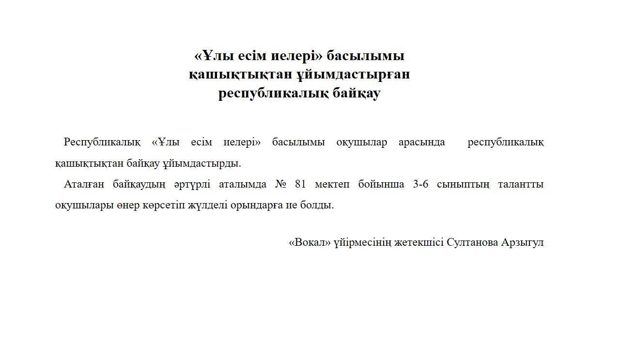 — деп, данышпан Абай айтып кеткендей, қазақ халқын қанына сіңген әні мен күйісіз ойлау мүмкін емес. Осындай өнерге деген жаны құмар оқушыларымыз қазіргі таңда аз емес. Өз өнерлерін көпшілік назарына ұсынып, әртүрлі байқауларға қатысып отыруларына ықпал жасап отырған музыка пәнінің мұғалімі Султанова Арзыгул апайға алғыс айтамыз.