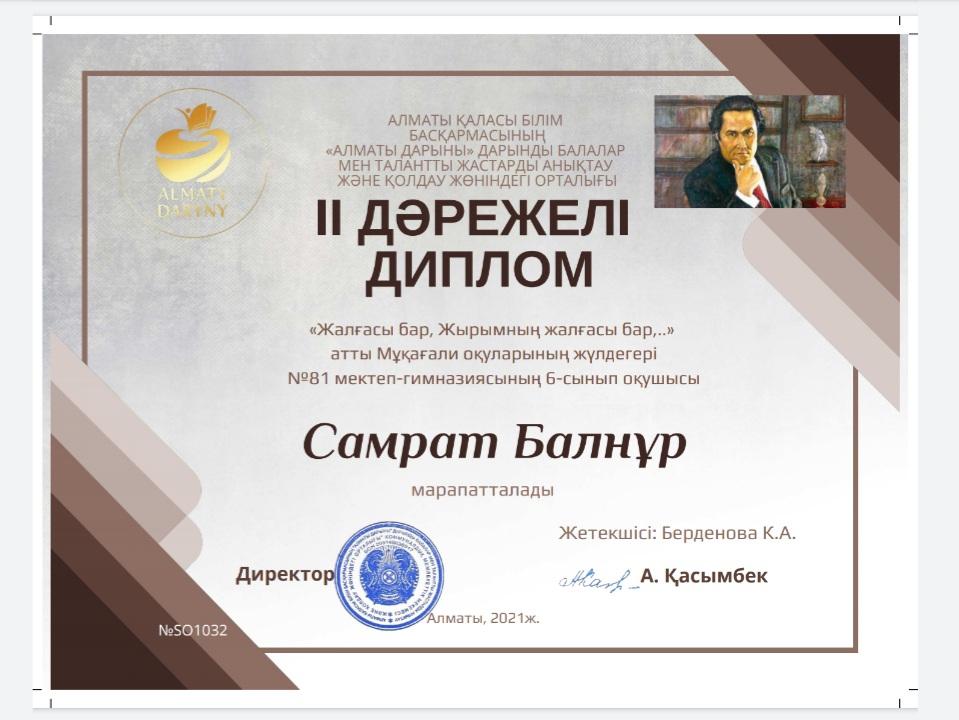 Алматы қаласы Білім басқармасы "Алматы дарыны" дарынды балаларды қолдау мен анықтау орталығының ұйымдастыруымен Мұқағали Мақатаевтың 90 жылдығына арналған "Жалғасы бар, жырымның жалғасы бар..." атты Мұқағали оқуларының жеңімпаздары мен жүлдегерлері «Алматы дарыны» орталығының I, II, III дәрежелі дипломдарымен марапатталады. 1 және 2 орын жүлдегерлері республикалық кезеңге жолдама алды. Жолдама алған оқушыларымызға алдағы жауапты кезеңнен сүрінбей өтіп мектеп мәртебесін көтере берулеріне тілек білдіреміз. Тек қана алға, әрқашан алда бол!