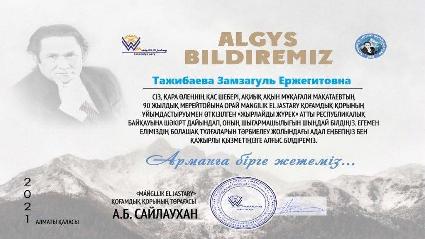 Сынып жетекшісі: З.Е Тажибаева алғыс хатпен марапатталды.