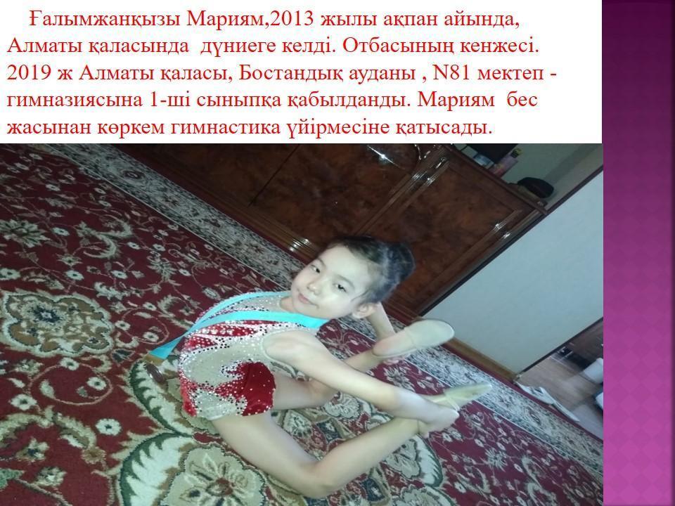 Ғалымжанқызы Мариям, 2013 жылы ақпан айында, Алматы қаласында дүниеге келді. Отбасының кенжесі. 2019 ж Алматы қаласы, Бостандық ауданы , N81 мектеп -гимназиясына 1-ші сыныпқа қабылданды. Мариям бес жасынан көркем гимнастика үйірмесіне қатысады. Осы азғана уақыттың ішінде кішкентай Мариям үлкен жетістіктерге жетті. "Өнерің үстем болсын",- деп тілек айтамыз кішкентай бүлдіршінге.