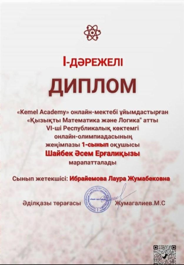 Kemel academy" мектебі онлайн-ұйымдастырған "Қызықты матаматика және логика" атты VІ көктемгі Республикалық онлайн-олимпиадасының жүлдегерлері, мектебіміздің 1Ә және 2 Б сыныбының оқушылары, ағайынды Шайбек Айзере мен Әсемді жеңістерімен құттықтаймыз.
