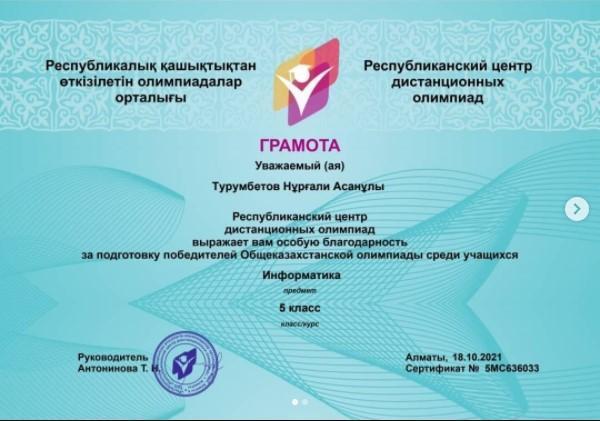Информатика пәнінен Республикалық қашықтықтан өткізілген олимпиаданың жүлдегері