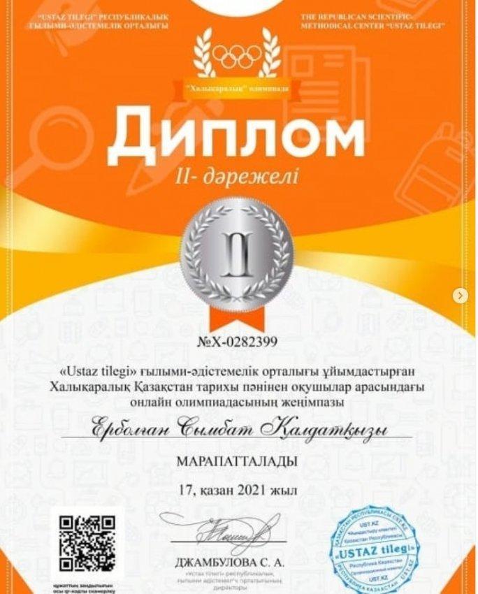 Республикалық Қазақстан тарихы пәнінен оқyшылар арасындағы онлайн олимпиадасының жеңімпазы