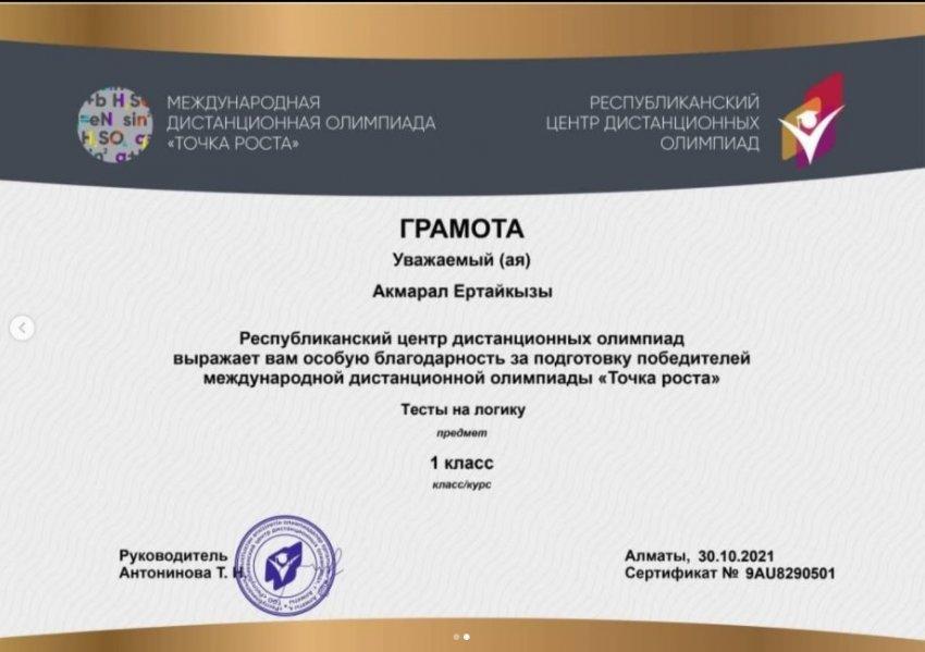30 қазан 2021 0 1 2 3 4 5 Халықаралық "Точка роста" олимпиадасының жеңімпазы 1 "Ә" сынып оқушысы Мухтар Дария халықаралық "Точка роста" олимпиадасына қатысып, І орын иеленді. Құттықтаймыз! Жетекшісі "Алғыс хатпен" марапатталды. https://www.instagram.com/p/CVqJqQTsHuT/?utm_source=ig_web_copy_link Осы беттің QR-коды:QR-код этой страницы: