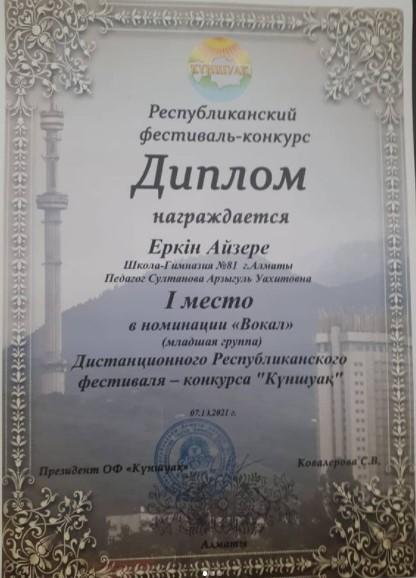Қашықтықтан ұйымдастырылған "Күн шуақ" республикалық фестиваль-байқауының "Вокал" жанрына қатысып, талантты әншілеріміз 7 "А" сынып оқушысы Салыбек Сая "ГРАН ПРИ"-ді, 3 "Ә" сынып оқушысы Бақытжан Семанұр мен 4 "Б" сынып оқушысы Ерік Айзере І орынды, 5 "А" сынып оқушысы Аманжол Адия мен 7 "А" сынып оқушысы Жанахмет Үкілім ІІ орынды иеленді. Оқушыларымызды жеңістерімен құттықтаймыз. Талаптарыңа нұр жаусын. Жетекшісі, музыка пәні мұғалімі: Султанова А.У