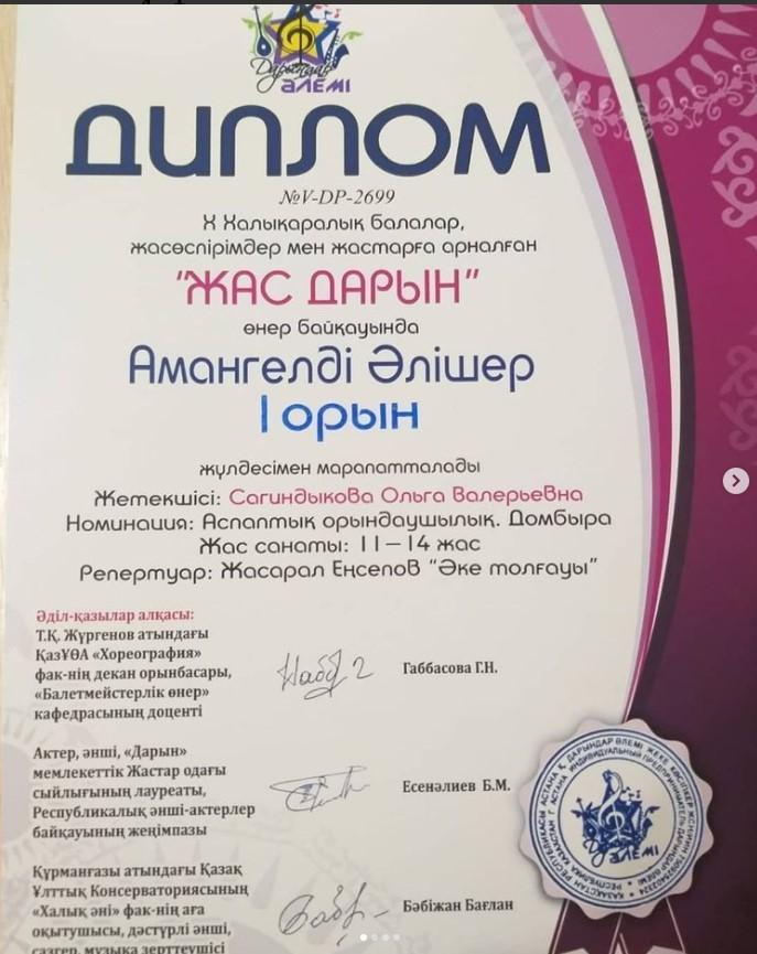 Халықаралық балалар мен жастарға арналған "ЖАС ДАРЫН" өнер байқауында 8 "Б" сынып оқушысы Амангелді Әлішер І орын иеленді. Өнерің үстем болсын, жас дарын! Сынып жетекшісі: Амангелді О.
