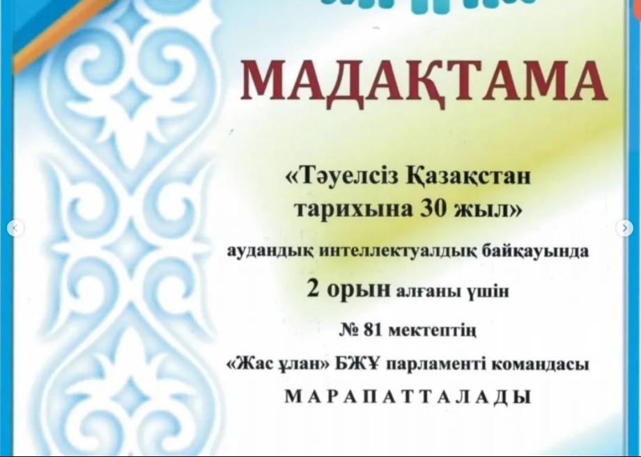 1.02.2021 күні, Қазақстан Республикасы Тәуелсіздігінің 30 жылдығына байланысты "Тәуелсіз Қазақстан тарихына 30 жыл" атты аудандық интеллектуалдық байқауында 2 орын алғаны үшін 81 мектептің "Жас Ұлан" БЖҰ парламенті командасы Бостандық ауданы, Білім бөлімінің мадақтамасымен марапатталды.