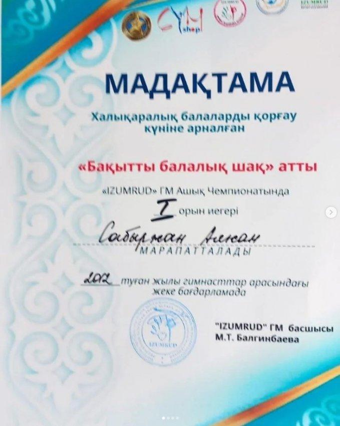 1 маусым -Халықаралық балалар күніне байланысты "Бақытты балалық шақ" атты "IZUMPUO" ГМ ашық чемпионатында 3 "Ә" сынып оқушысы Сабыржан Аяжан І дәрежелі дипломмен марапатталды. Аяжан - көркем гимнастика шебері, талабыңа нұр жаусын!