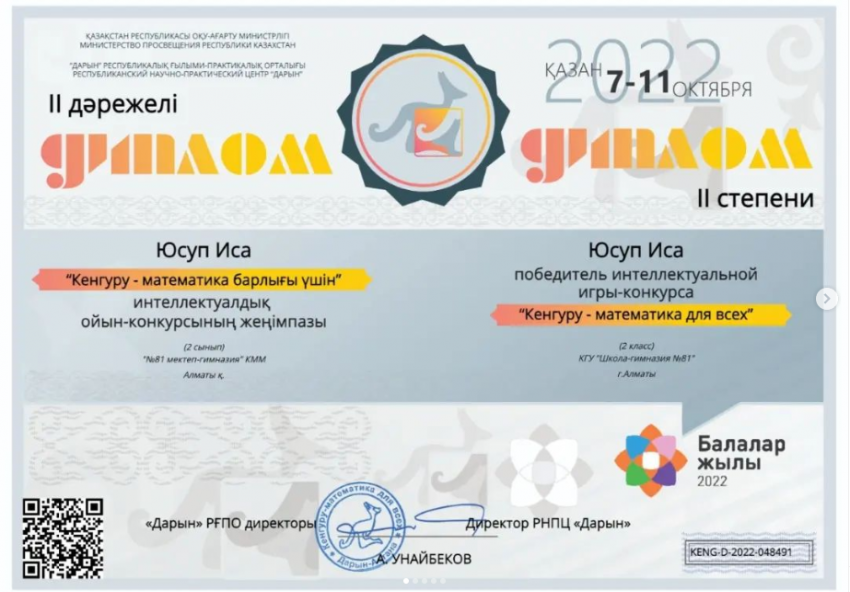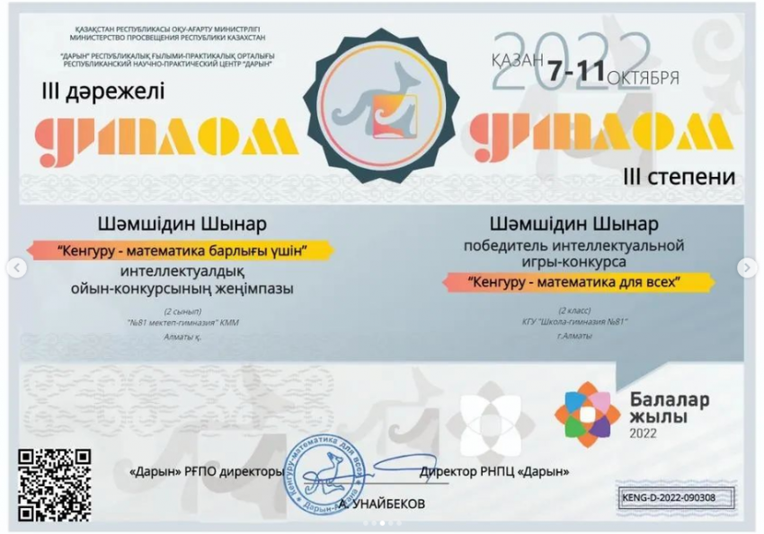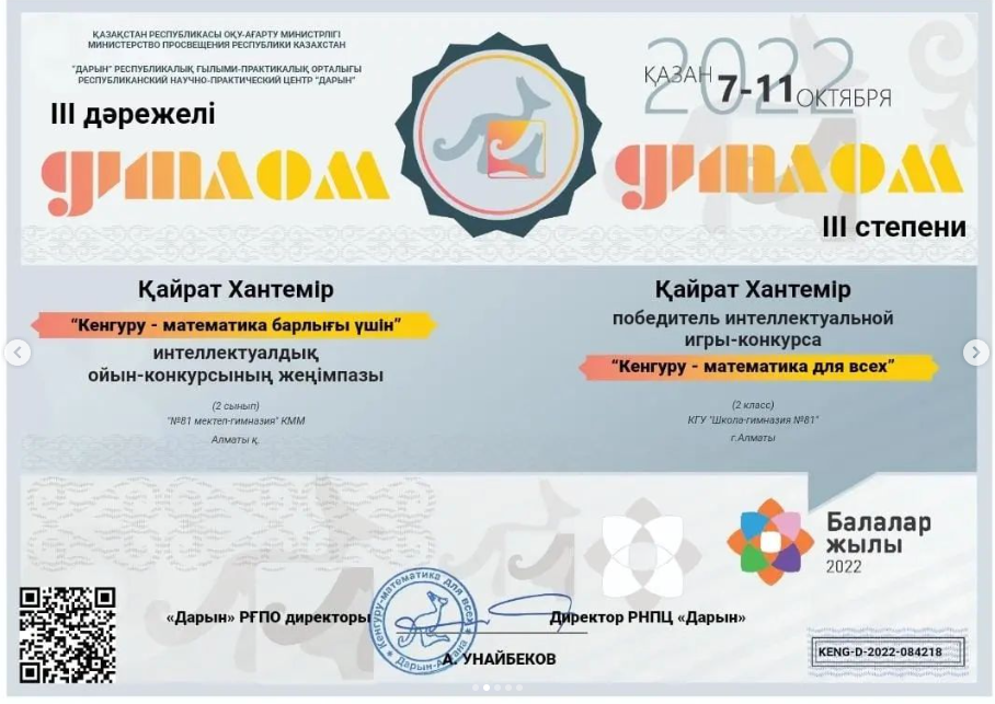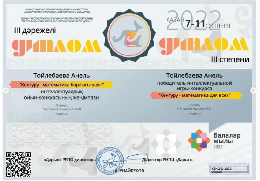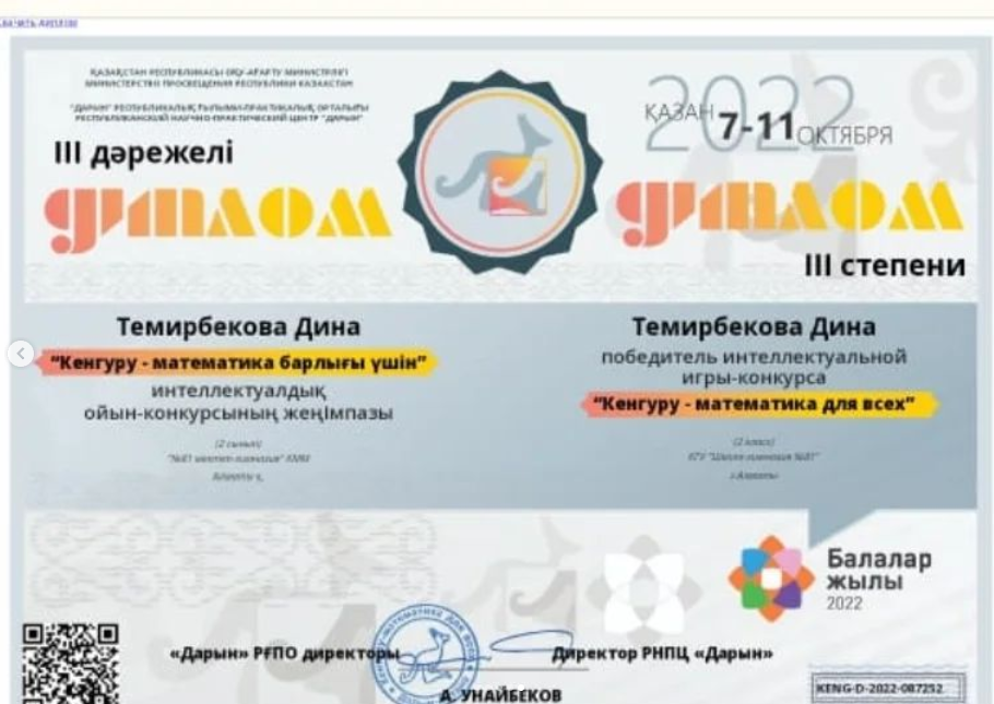 "Дарын" республикалық ғылыми-практикалық орталығы ұйымдастырған "Кенгуру - математика барлығы үшін" интеллектуалдық ойын-конкурсының жеңімпаздары, 2 "А" сынып оқушылары ІІ-ІІІ дәрежелі дипломмен марапатталды. Жеңімпаз шәкірттерімізді құттықтаймыз.???