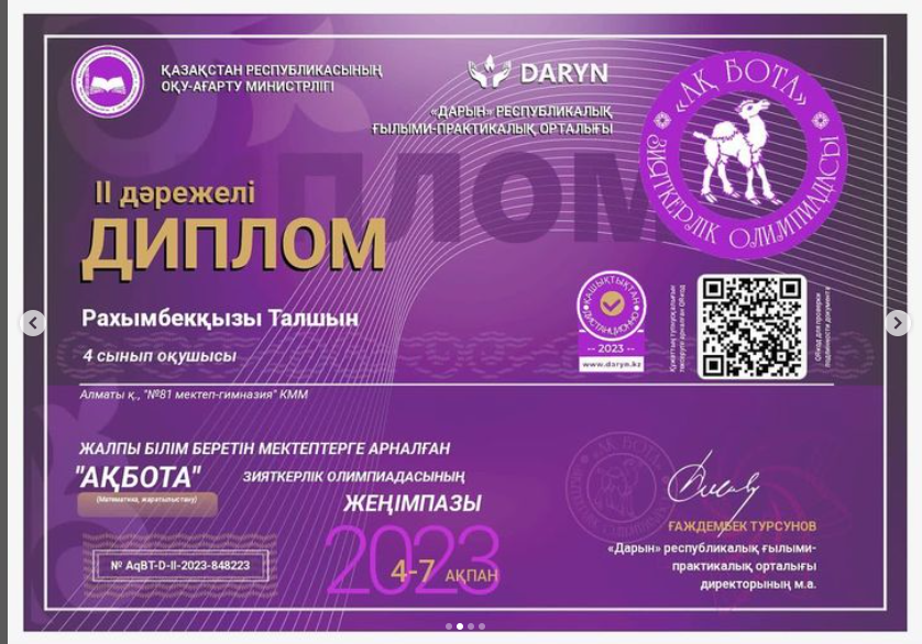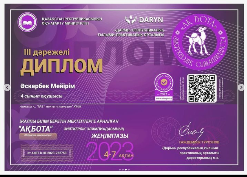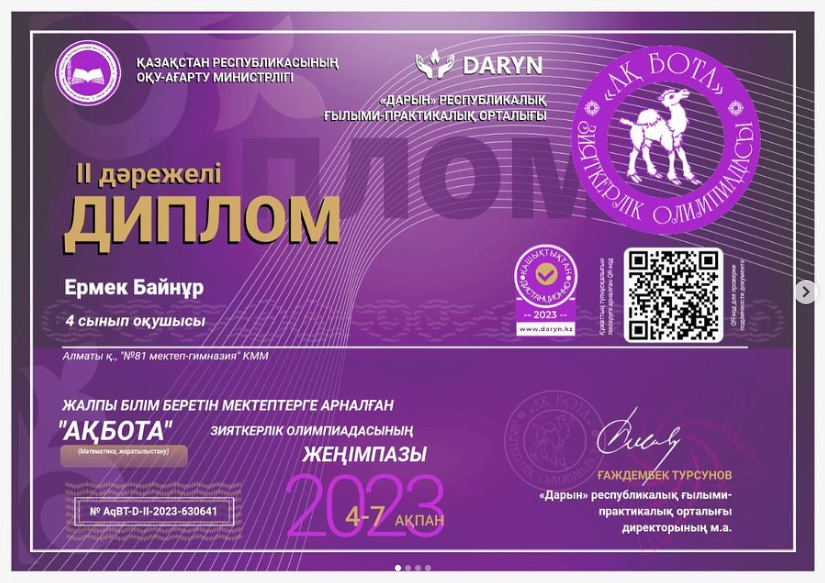 13 ақпан 2023 0 1 2 3 4 5 “АҚБОТА” зияткерлік олимпиадасының жеңімпаздары ДАРЫН” республикалық ғылыми-практикалық орталығы“АҚБОТА” зияткерлік олимпиадаға қатысып, жүлделі орын алған 4 «А» сыныбы жеңімпаздарын жеңістерімен құттықтаймыз! Жарайсыздар!????Сынып жетекшісі:Женсикбаева А.С. Осы беттің QR-коды:QR-код этой страницы: