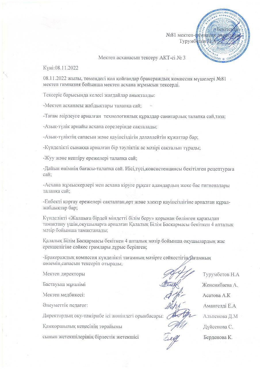 08.11.2022 күні оқушыларының ыстық тамағының сапалы ұйымдастырылуын және асхананың санитарлық тазалығын тексеру мақсатында бракераж комиссия мүшелері